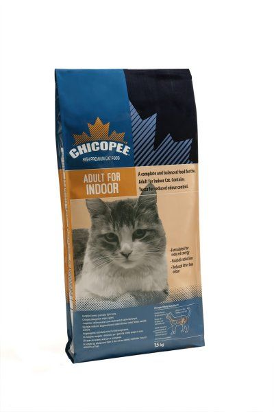 Chicopee Adult Indoor Cat je kompletní krmivo pro kočky žijící doma. S přídavkem extraktu Yucca pro omezení zápachu z exkrementů.