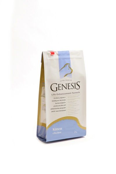 Kočka jako masožravec potřebuje pro svůj vývoj maso a proteiny v něm obsažené. Genesis Kitten je ultra prémiové krmivo vytvořené tak, aby koťatům poskytlo proteiny velmi dobře stravitelných surovin - z kuřecího masa, ryb a vajec. Genesis Kitten je také doplněno o DL-methionine důležitý pro růst srsti. Taurin je v krmivu přítomen pro správný vývoj očí a srdce. Suroviny obsažené v krmivu Genesis Kitten dodají Vašemu kotěti přesně to co potřebuje. Krmivo je zároveň velice chutné, takže kotěti poskytnete opravdu to nejlepší