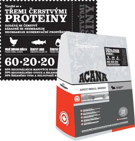 Krmivo ACANA obsahuje více proteinů, přiměřené množství tuků a méně sacharidů. Lépe tak odpovídá přirozené stravě psů malých plemen. Toto výjimečné krmivo neobsahuje pšenici, kukuřici a lepek, suroviny často spojované s potravinovými alergiemi. Namísto toho ACANA obsahuje místní ovoce, zeleninu a řezaný oves – zdravé sacharidy s nízkým glykemickým indexem, které obsahují málo jednoduchých cukrů, jež způsobují kolísání krevního cukru a vedou k nadváze u psů malých plemen.