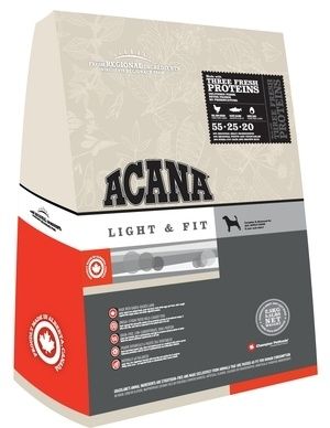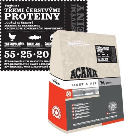 Aby ACANA LIGHT & FIT příznivě působila na štíhlou linii je nabita prvotřídními živočišnými surovinami (55%), včetně volně chovaných kuřat a vajec z místních prérijních farem, lososů ze studených vod Tichého oceánu u Vancouver Island – tyto suroviny jsou dodávány DENNĚ ČERSTVÉ, nemražené a bez konzervačních prostředků.