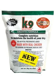K-9 Selection GROWTH je speciální kompletní výživa pro štěňata a rychle rostoucí psy i pro březí a kojící feny malých plemen. Mnoha generacemi psů prověřené krmivo vyrobené z kuřat, proto velmi lehce stravitelné a výživné. Používá se také pro dospělé psy malých plemen trpící nechutenstvím k povzbuzení jejich chutě a zlepšení kondice