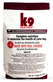 K-9 Selection HI-PERFORMANCE je krmivo pro velmi aktivní výkonné psy. Více než 60% obsahu v sušině je tvořeno kuřecími produkty poskytujícími vynikající stravitelnost, vysokou výživnou hodnotu i přitažlivou chuť. Mimořádně vhodné pro psy ve výcviku, ve sportovním tréninku, v pravidelné službě, pro psy dostihové, tažné či jinak pracovně využívané.