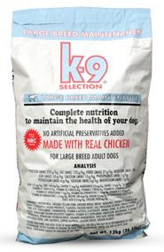 K-9 Selection MAINTENANCE LARGE BREED poskytuje dospělému psovi s běžnou aktivitou všechno nezbytné k dosažení kvalitního života. Je vhodným celoživotním krmivem pro psy, kteří už ukončili fázi růstu. Mnoha generacemi psů prověřené krmivo vyrobené z kuřat je velmi lehce stravitelné, udržuje dobré zdraví, tělesnou kondici a kvalitní srst.