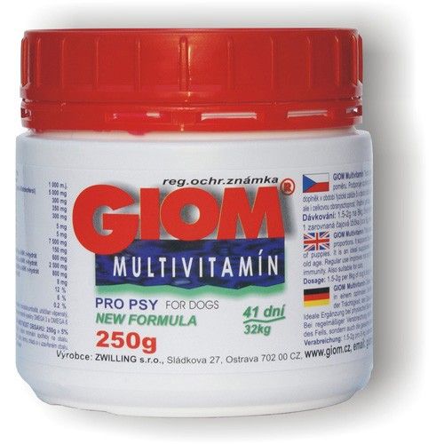 Giom MULTIVITAMÍN je potravinový doplněk pro zajištění optimálního přísunu vitamínů a minerálů psům a kočkám v období zvýšené fyzické zátěže.